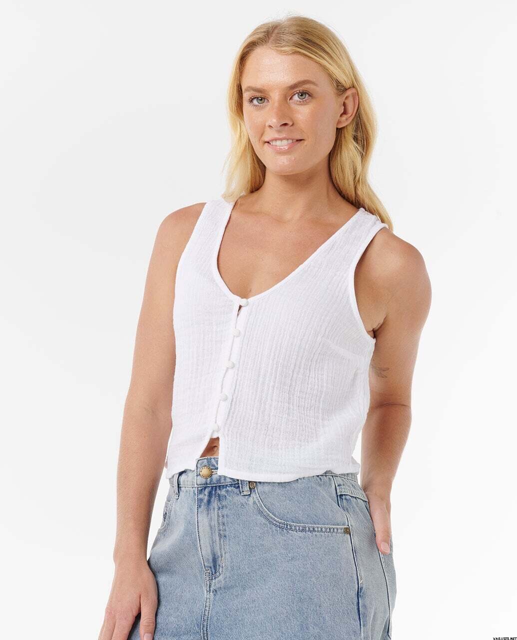 Topul Rip Curl Premium Surf pentru femei oferă confort lejer pentru vreme caldă, cu o textură dublă de tifon cu textură fină, pentru un look relaxat, de coastă. Acest top fără mâneci este potrivit atât pentru acoperirea rapidă după o baie, cât și ca un strat simplu de zi cu zi cu blugi. O închidere completă cu nasturi în față și un detaliu subtil din metal cu logo completează stilul curat și casual.