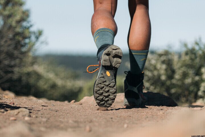 - Tricotajul ranforsat de înaltă densitate la nivelul piciorului și manșetei ajută la protejarea împotriva abraziunii și a resturilor de pe traseu