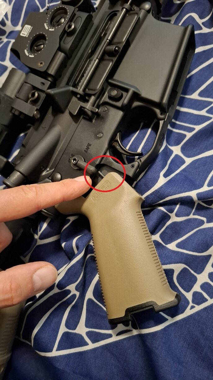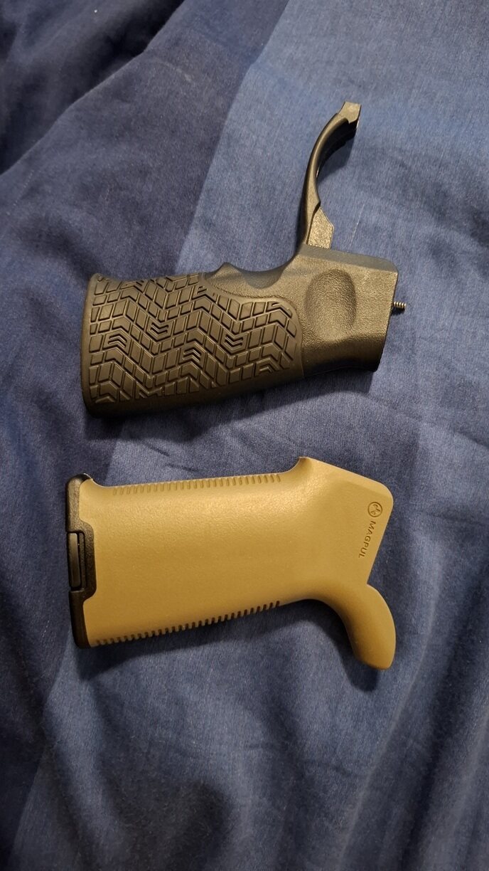 Эта вставная конструкция AR15/M4, похожая по форме на MIAD ® среднего размера, имеет нижнюю кромку из твердого полимера, что снижает вероятность зацепления оборудования или повреждения рукоятки. В комплект MOE+ Grip можно установить дополнительные отсеки для хранения снаряжения, а также имеется базовая крышка для рукоятки.