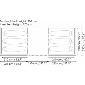 The outer tent is made of PU Coated Polyester and can handle a 3000 mm water column. The inner tent is made of Oxford Polyester and the floor fabric can handle a 7000 mm water column. The tent is equipped with storm guy lines. The tents have privacy windows and a floor that can easily be snapped into place between the sleeping compartments. They also come with poles that allow you to raise the door for rain protection or a shady spot outside the tent.