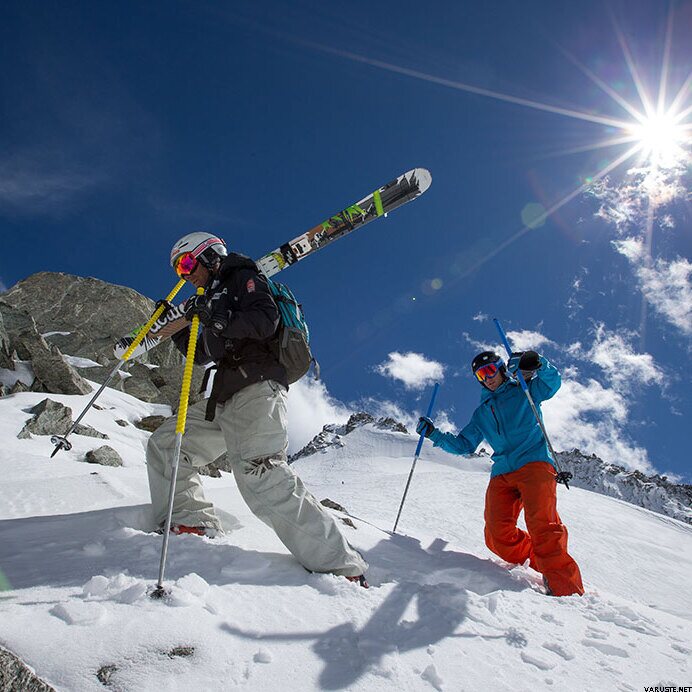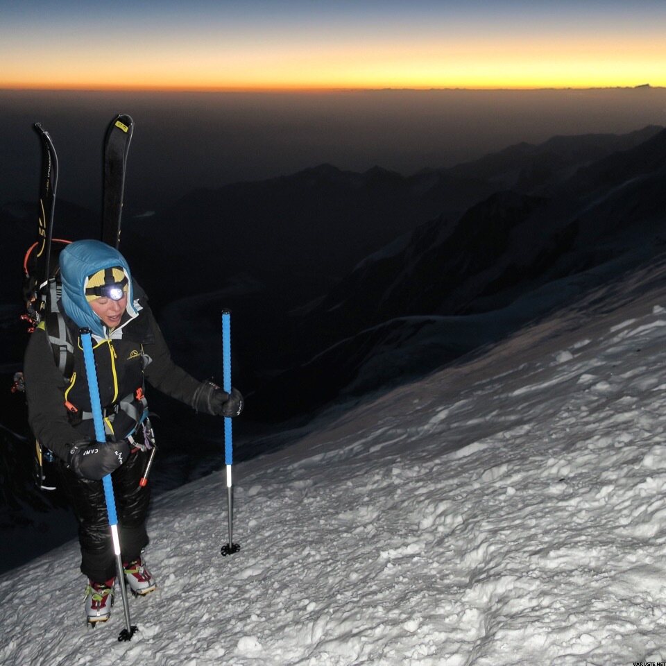 Chamonix skidbergsklättringsstav. Tillverkade av bergsguiden Alain Desez, 18 mm aluminiumstavarna har långa räfflade skumgrepp som sträcker sig nästan halvvägs ner för varje stolpe. Alain's Sticks är hållbara och låter dig greppa var som helst längs den övre halvan av varje stav utan att halka. Dessutom inga handledsband! Remmar kan göra vanliga fall ganska farliga och kan göra det svårt att aktivera din krockkudde vid en lavin. Utan dem kan du lättare sänka stavarnas toppar i snö. Bevisad av Chamoniards bergsguider på branta nordsidor och av amerikanska alpinister på rutter som Forakers Archangel Ridge, den högsta nivån av stavdesign är nu tillgänglig för de puderjaktande, couloir-droppande, europeiska flaggälskande massorna.
