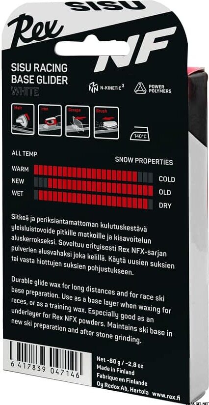 - Förbättrar vattenavvisande egenskaper och glid på ny och blandad snö