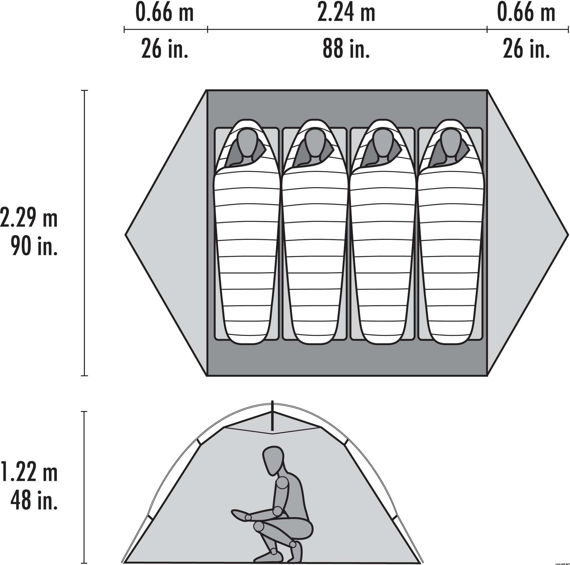 • Rymligt rektangulärt golv passar breda liggunderlag utan överlappning och ger 1,22 m (48 tum) topphöjd för bättre komfort vid sittställning