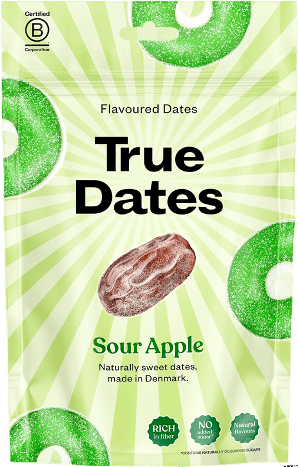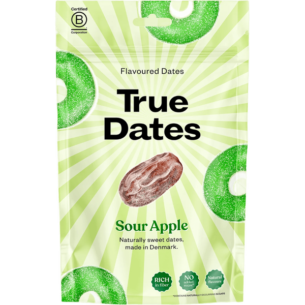 True Co. True Dates Sour Apple 100g ger en smakrik söt och syrlig smak genom att kombinera naturligt söta dadlar med en krispig, syrlig äppelsmak. Dessa snacks är lätta att njuta av när man är på språng när man behöver en snabb, fruktbaserad godbit. Dadlarna är urkärnade för en smidigare mellanmålsupplevelse och en bekvämare ätupplevelse.
