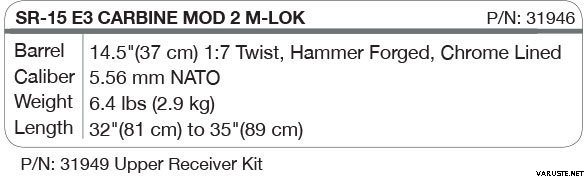 ProduktbeskrivningThe SR-15 E3 Mod 2 series’ 5.56 mm NATO barrel is manufactured for military grade durability, and is free-floated inside a URX4 M-LOK handguard. An improved E3 round-lug bolt design both enhances function and increases bolt life far beyond the industry standard. The ambidextrous bolt release, selector lever, and magazine release offers left-handed users the ergonomic advantages inherent to AR15-based controls. The drop-in two-stage trigger serves double duty as an aid to precision marksmanship while enabling surgical speed shooting at close range. The 5.56 mm 3-Prong Flash Eliminator interferes with propellant gas combustion forward of the muzzle to significantly reduce flash signature, will not ring upon firing or when struck, and is compatible with the Knight’s line of 5.56 mm QDC Signature Reduction Devices.
