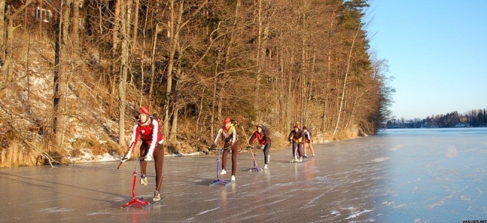 Kicking on snow-free ice with the Ice Runners is a whole new winter sports and outdoors experience. Racers reach speeds of 25-40km/h depending on the distance (100km record being 3:38:50). Long touring on (sunny?) spring ice is something Kickspark riders keep talking about when the ice is gone.