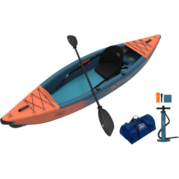 该套装包含桨、长凳、脚凳、快速双动泵(拉和推时泵送)、手提袋、鳍、用于运输货物的橡皮筋和修理工具包。独木舟很快就能装满水,大约十分钟就可以划行,而且只需几分钟就可以轻松放回手提袋中。高品质皮划艇享有三年保修期。