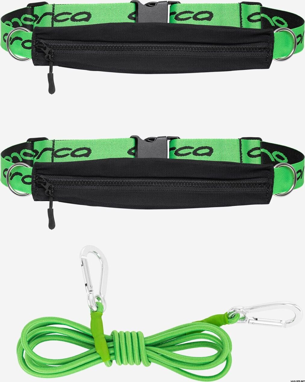 Orca 的 Swimrun 弹力绳可让您和您的队友在比赛中保持在一起。由两条比赛腰带和一根 3 米长的弹力绳组成,其中一个可调节环可连接到您的队友,另一个固定环可连接必要的 Swimrun 配件,让您在比赛期间保持解放双手。始终与您的伴侣保持联系,无后顾之忧。